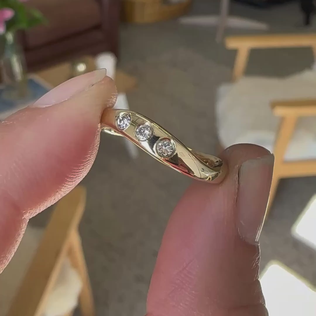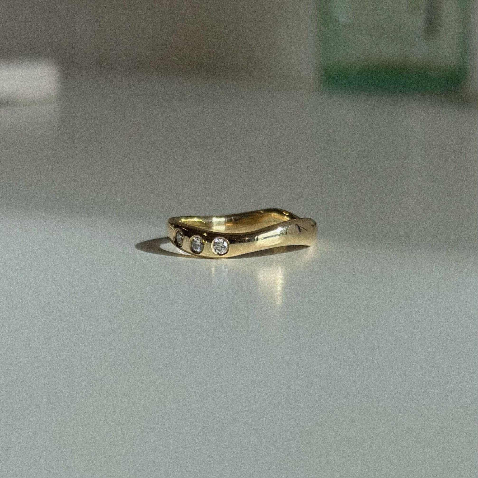 Introducing a sculptural and understated piece designed for quiet luxury lovers. This organic-form ring features a gently undulating silhouette, crafted in warm polished gold. Three round brilliant stones are flush-set along the band, catching light with a subtle and elegant sparkle. The soft, fluid shape sits beautifully against the hand, offering both comfort and a modern feel.