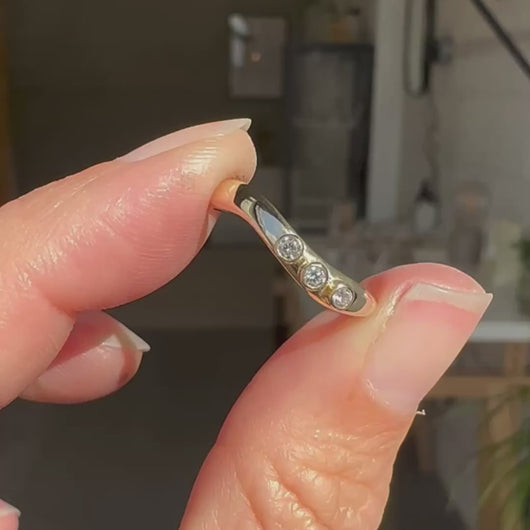 A gentle wave, shaped with quiet precision. Three small diamonds are bezel set along one curve, embracing refined asymmetry — understated, contemporary, and crafted for those who prefer natural elegance over perfect lines.