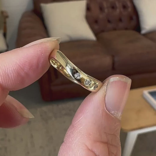 A gentle wave, shaped with quiet precision. Three small diamonds sit flush along one edge, offering a soft, balanced glimmer. Understated and refined, this ring brings light to form — subtle, calm, and modern.