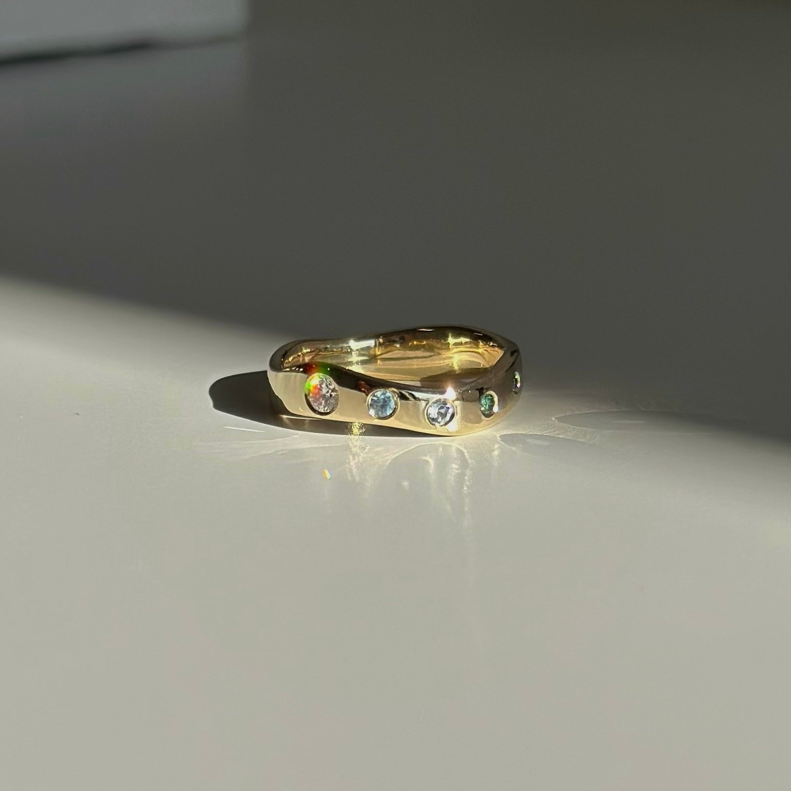 A beautifully crafted wavy gold band that captures the fluidity of the ocean in its design. This band is flush set with a natural diamond, seagreen diamond, ocean blue diamond, and blue sapphires, creating a harmonious blend of subtle sparkle and vibrant colour. Each stone is carefully chosen for its unique tone, making every ring one-of-a-kind. Perfect as a stackable piece or a statement band, this ring is a celebration of individuality and timeless elegance.